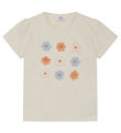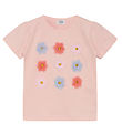 Beautiful Hust and Claire t-shirt in light rose, with beautiful flower appliqués in tulle on the front in blue and pink and with embroidered gold knobs in the middle.