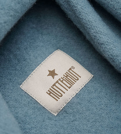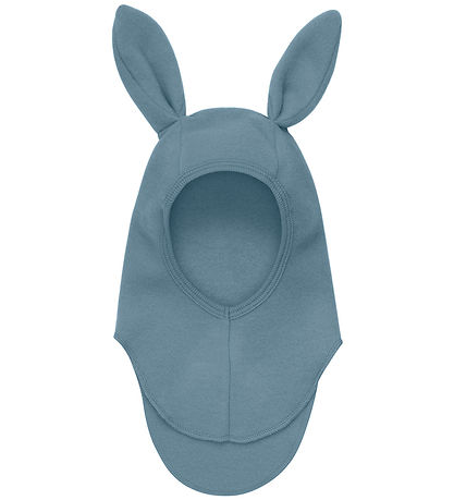 Fine Huttelihut balaclava in plain, dusty blue made of warm wool fleece. In the neck there is a logo patch.