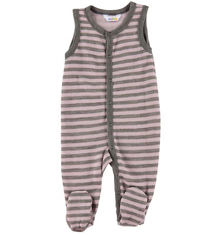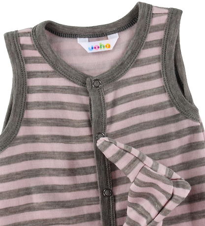 The Joha romper has no sleeves and long legs with fixed feet. The Romper opens at the front with its practical, continuous push buttons, which starts at the neck opening and end at the left ankle. The Romper is made of a soft and comfortable wool quality.