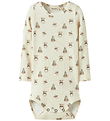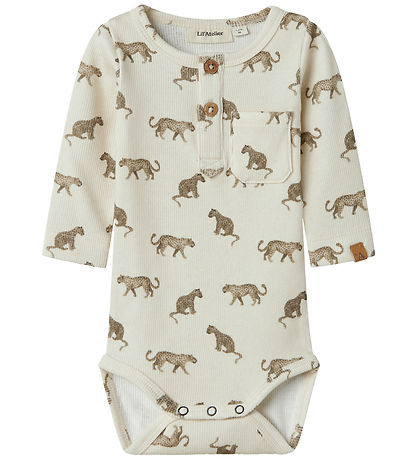 Cute Lil' Atelier bodysuit in light beige rib with a print of brown leopards. The Bodysuit has a round neckline with two pull buttons at the front and a little chest pocket. It has long sleeves and practical push buttons between the legs.