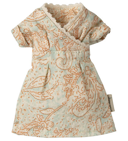 Nice Maileg mouse in beige and wearing a light dress.