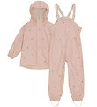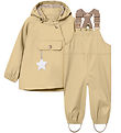 Beautiful MarMar rainwear with stripes in beige and navy, and it is made of practical PU. The Rainwear consists of a rain jacket and a pair of rain pants with suspenders.