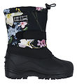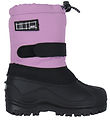 Cool Molo winter boots with black rubber around the foot and a pink textile shaft. On the outside of the shaft there is a black and white rubber logo application.