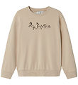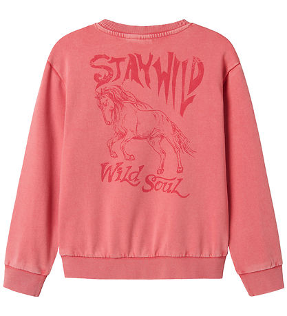 Cool Name It sweatshirt in pink with a horse print and the text "Wild Soul" in pink on the left chest. On the back there is a large print of a horse and the text "Stay Wild, Wild Soul" in pink. The Name It sweatshirt has a round neckline and long sleeves with ribbed edges at all openings.