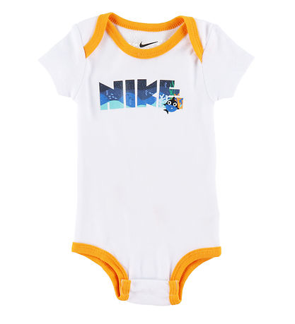 - The Bodysuit is white, with "Nike" and a fish printed on the chest in shades of blue, green and orange. The edges of the neck and legs are orange.