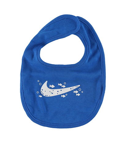 - The Bib is in blue, with a large logo print and small fish printed in white on the front.