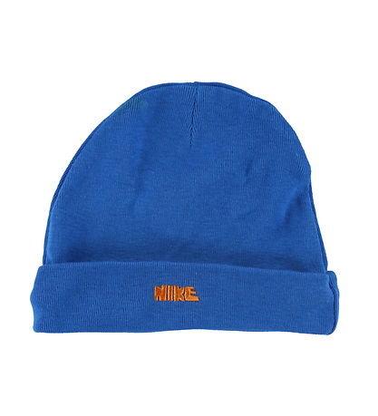 - The Beanie is blue, with "Nike" embroidered in orange on the brim at the front.