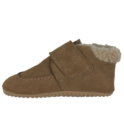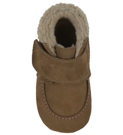 The Pom Pom soft sole leather shoes are closed over the instep with a wide Velcro strap. On the inside, there is soft, beige-colored wool, and the outer soles are made of rubber with small knobs, which provide a good foothold.