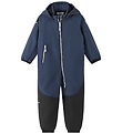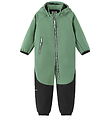 The Reima softshell suit has a removable hood that is fastened with push buttons along the neck collar. The arm and the leg openings have narrow elastic edges, and the softshell suit also has removable, adjustable rubber bootstraps.