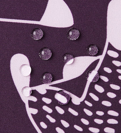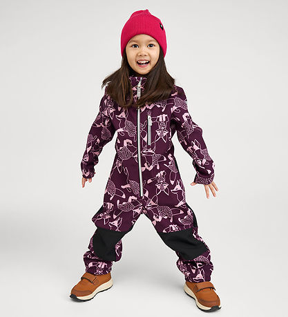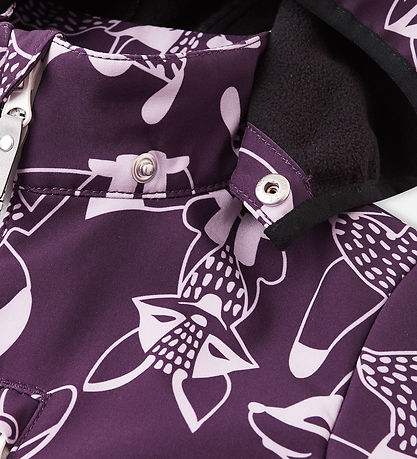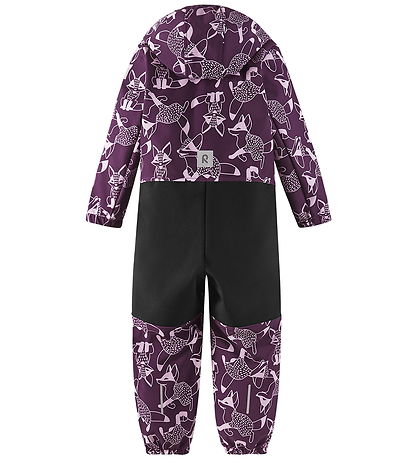 Nice Reima softshell suit in dark purple with a pink allover print of foxes with white zippers, black reinforcements and a nice, soft fleece lining inside.