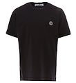 Nice Stone Island t-shirt in plain black, and on the left side there is a black brand with a white logo.