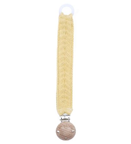 Beautiful Smallstuff pacifier clip in yellow and crochet in cotton with a nice herringbone pattern.