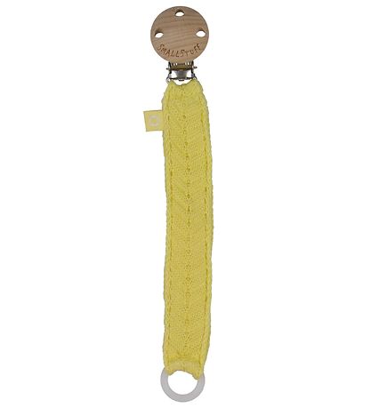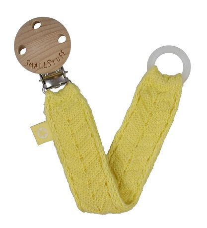 Beautiful Smallstuff pacifier clip in dusty yellow and crochet in cotton with a nice herringbone pattern.