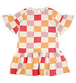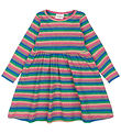 The New dress has long sleeves with narrow elastic edges. At the waist, it has a narrow elastic, and underneath the skirt falls with plenty of width. The Dress opens at the front with buttons, and there are practical pockets on the sides. The Dress is made in a tightly woven viscose quality.