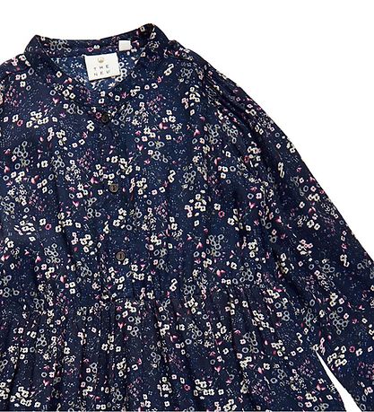 Sweet The New dress in navy with an all-over floral print in pink, white and dusty blue and with details in dusty green.