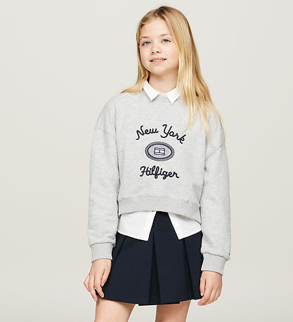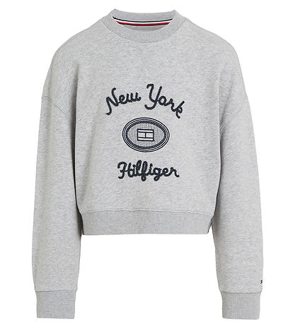 Fine Tommy Hilfiger sweatshirt in melange grey, and "New York Hilfiger" is sewn on the front with navy blue beads, as well as the Tommy Hilfiger logo embroidered in navy blue on the front.