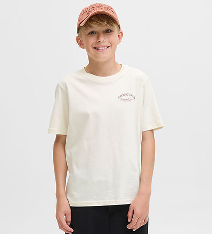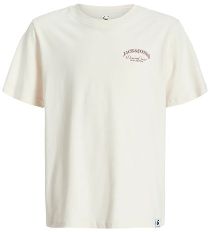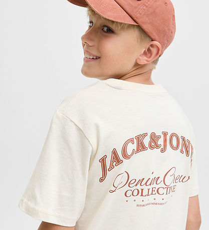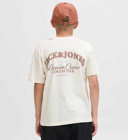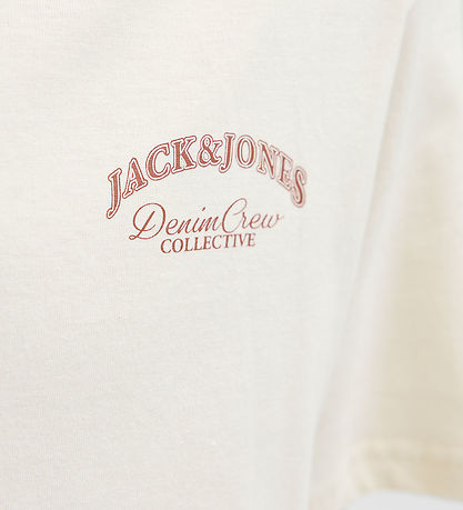 Stylish Jack & Jones t-shirt in a soft cream color. The T-shirt has a nice print on the left chest of the Jack & Jones logo and the text "Denim Crew Collective" in brown. On the back there is a large matching logo print.