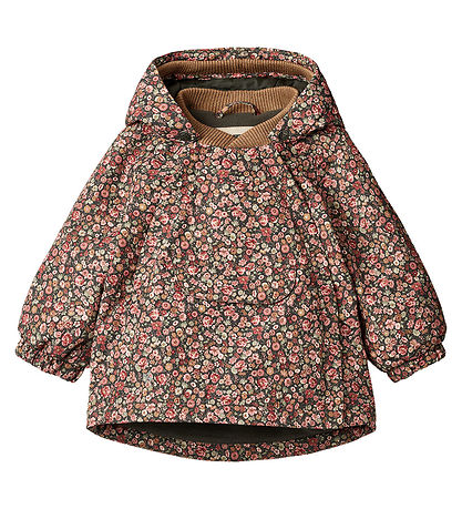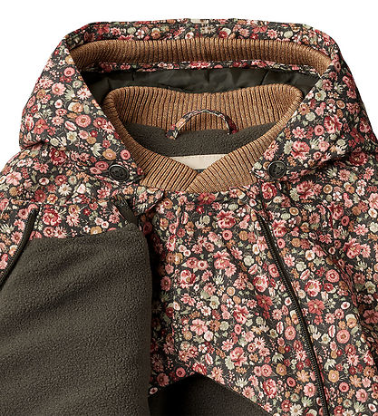 The Wheat winter coat has a removable hood that fastens with push buttons around the ribbed collar, and in the face opening there is a wide ribbed edge. The sleeves have wide, fleece-lined elastic edges.