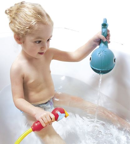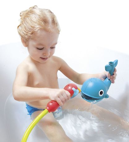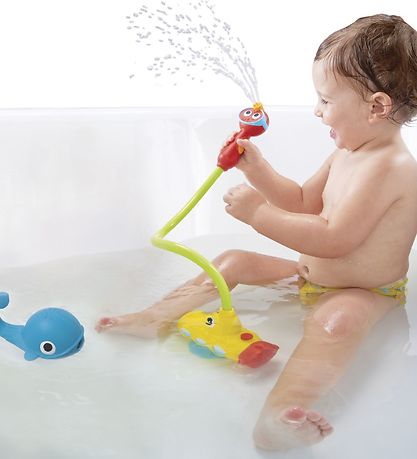 The Yookidoo bath toy can spray water from the small shower head of the submarine. The whale has a hole on top and this can be attached to the shower head to make the whale spray with water. The submarine is battery-powered and is made so that a gentle jet of water comes out of the shower head. The bath toy can be used by the very young children in the bath or as a bath toy for the older children.