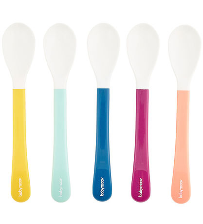 Practical Babymoov baby spoons sold in a 5-pack in attractive colours