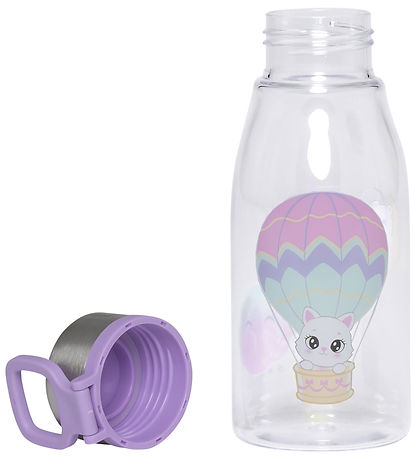 Nice Beckmann water bottle in ready plastic with a silver lid and purple details. On the side there is a print of a cute cat in a hot air balloon.