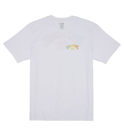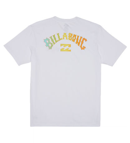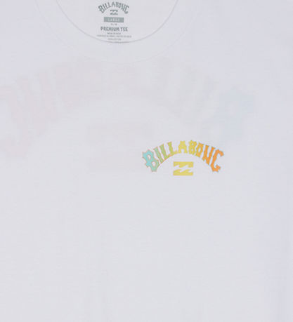 Cool Billabong t-shirt in white, with a print on the left chest of the brand's name and logo in shades of blue, green, yellow and orange. The same print is on the back, in a large version.