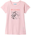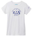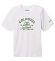 Smart Columbia T-shirt in white with a print on the front of the text "Always outside" and "side by side" as well as a print of mountains, trees and a sun all in orange and pink shades. On the left sleeve is the Columbia logo in coral color.