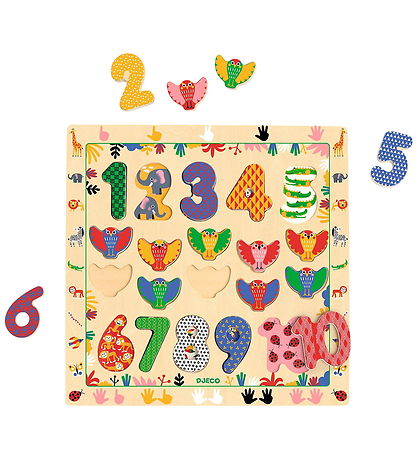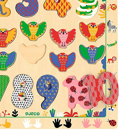The Djeco puzzle has 20 bricks and consists of a square plate with recesses that the pieces fit into. Each piece sticks out slightly above the edge of the plate, so it is easy for the little to grab the pieces.