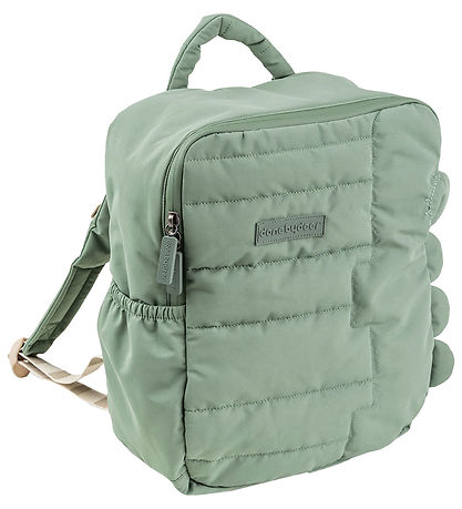 Cute Done by Deer backpack in dusty green with quilted structure. On the front there is a logo patch, and on the front on one side there is an embroidered crocodile.