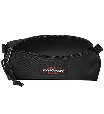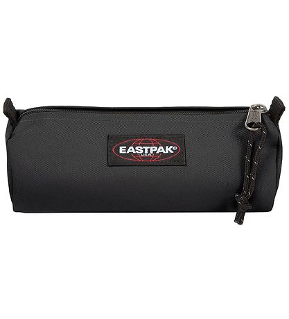 The Eastpak pencil case is elongated and has a round shape with a flat bottom. The pencil case opens at the top with a zipper.