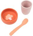 Smart Filibabba dinner set which includes a plate, a bowl and a cup, all parts in rose.