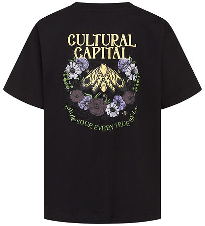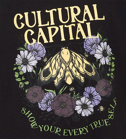 Cool Grunt t-shirt in black with a nice print on the back of the text "Cultural capital" as well as pretty flowers and a night warmer.