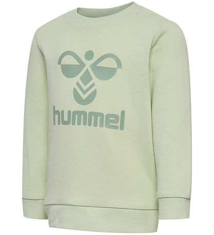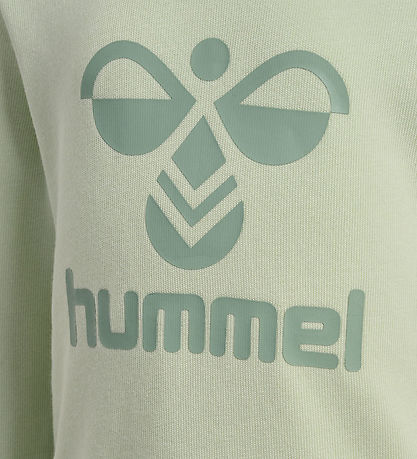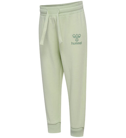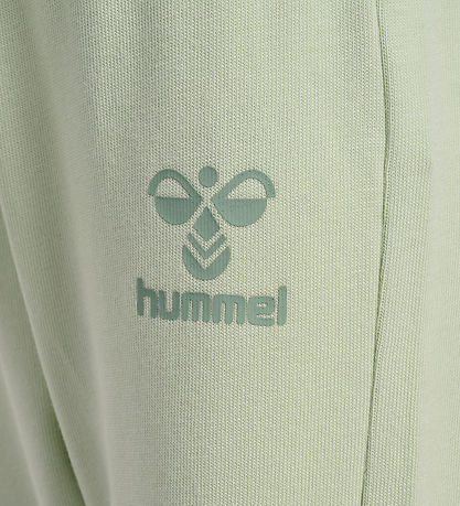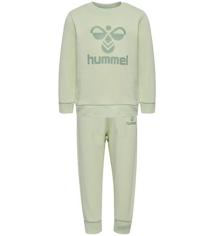 Fine Hummel set in a light pastel green colour. The Set consists of a blouse adorned with a large logo print in dark green on the front and trousers with a little, dark green logo print on the left thigh.