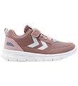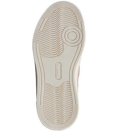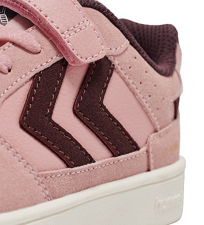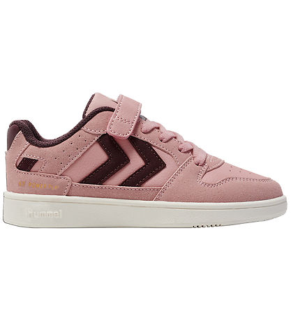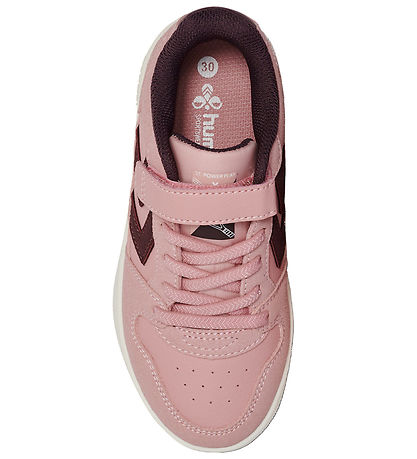 Nice Hummel shoes made of light pink, imitation leather. The shoes have the characteristic Hummel shevrons on the inside and outside in purple.