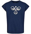 Nice Hummel t-shirt in a dusty dark blue colour with a nice logo print in silver glitter on the front.