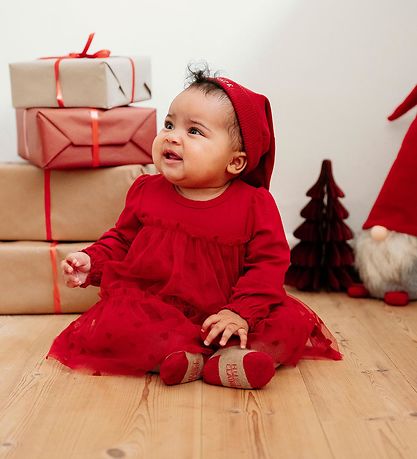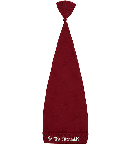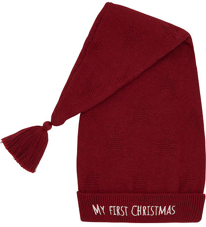 Charming Hust and Claire christmas hat in a deep red shade with a fine fiber tassel and the text "MY FIRST CHRISTMAS" embroidered on the edge. The Beanie also has a light structure with stars, which gives a sweet touch.