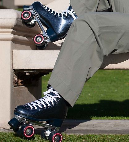 Fine Impala rollerskates in navy with blue and purple glitter and white laces. The roller skates have navy wheels with a red exterior.