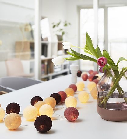 The Iris Lights light chain contains 35 light balls, which are spun by hand from a beautiful cotton thread. The chain has a circular shape with 14 cm between each light. You have to put the balls on the light chain yourself - then you can decide for yourself how the colours should be combined.