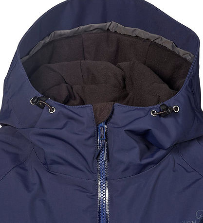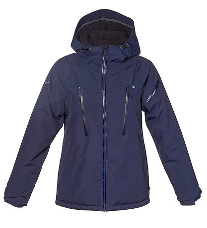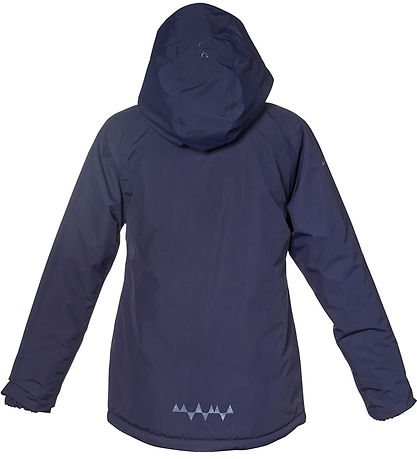 Nice Isbjörn of Sweden winter coat in navy blue. The Winter coat has a grey logo print on the left chest and the hood, as well as smart reflective prints on the lower back and right shoulder.