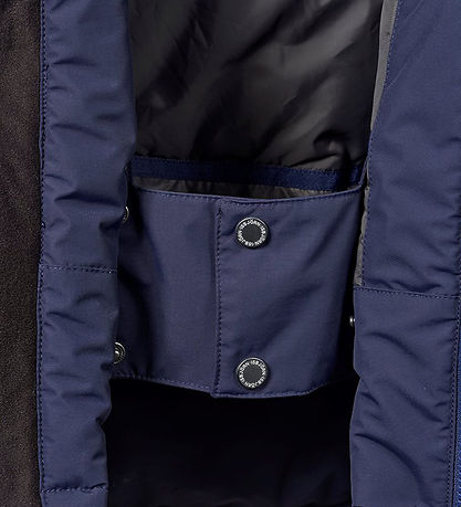 The Winter coat has two vertical chest pockets with zip closures. Around the waist there is an elastic snow-cuffs, which has a rubber coating on the inside. The snow flap is opened and closed with push buttons at the front, and when the snow flap is not in use, it can be attached to the lining with a push-botton. In the waist opening itself, the winter coat has a little high/low effect and an internally adjustable elastic edge.
