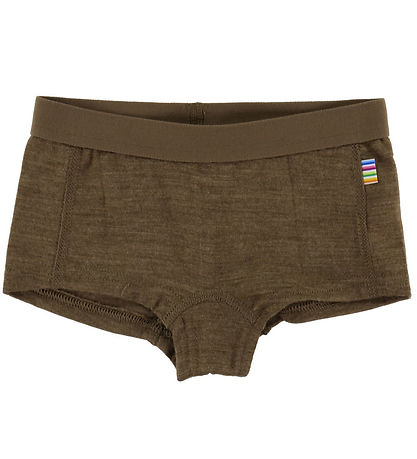 Well-fitting Joha hipsters in a simple brown colour. The Joha hipsters have an elastic waistband for a good fit. The material appears plain without a pattern, and there is a little, colourful detail on the left side. The fabric structure is smooth, which contributes to the overall appearance.