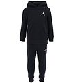 The Jordan hoodie has a Fast hood, long sleeves and wide hems. There is a kangaroo pocket on the front. The sweatpants have long legs and wide hems, and a wide elastic edge. The sweat set has soft, brushed cotton on the inside.