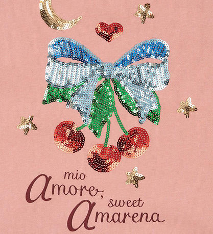The Konges Sløjd cardigan has a decorative cherry sequin print on the front and back, which adds a unique touch. It has long sleeves and ribbed edges for a comfortable fit.