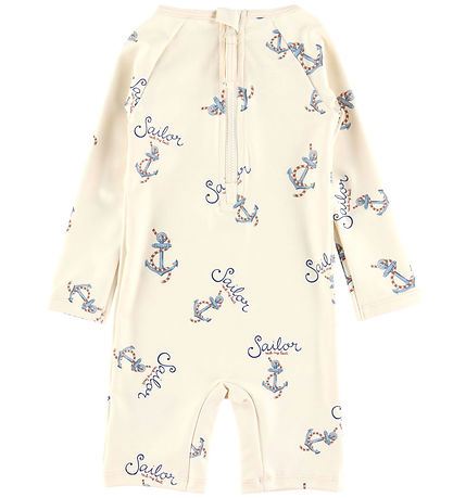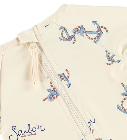 Charming Konges Sløjd coverall swimsuit in a light, cream white shade. The swimsuit is adorned with a maritime theme, showing blue anchors and the word "Sailor" printed all over. It has long sleeves, a round neckline and a zipper closure at the back, making it easy of and take off.
