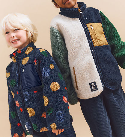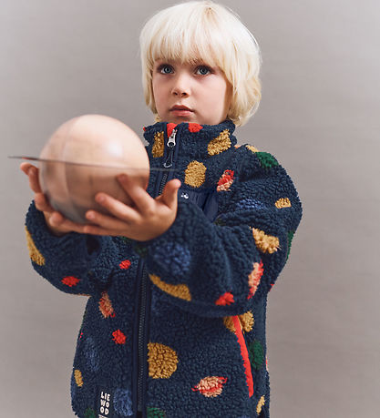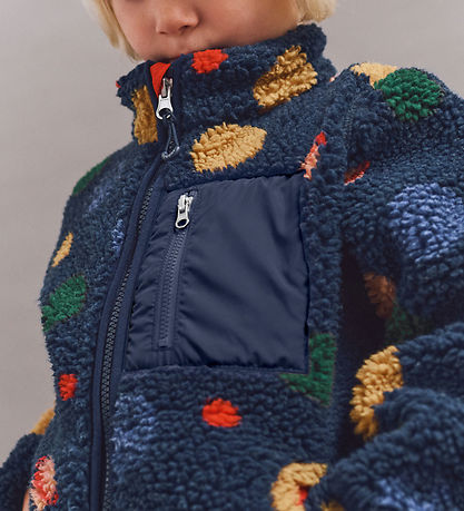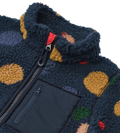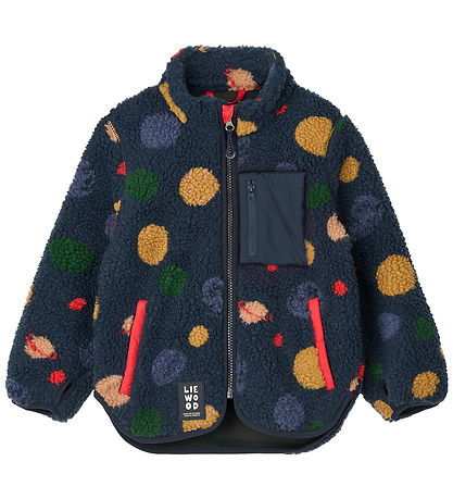 Beautiful Liewood fleece jacket in a beautiful navy blue shade with colorful dots in yellow, red, green and blue. The Fleece jacket is made of soft teddy fleece, which gives it a cozy look.