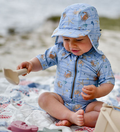 Lovely Mikk-Line coverall swimsuit with short sleeves in a light blue colour. It has a charming print with crabs and starfish. The Mikk-Line swimsuit has a practical zipper in the front.