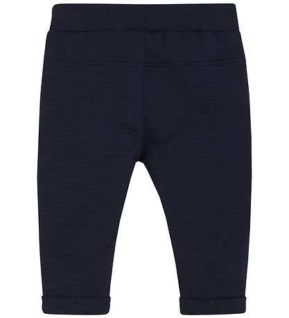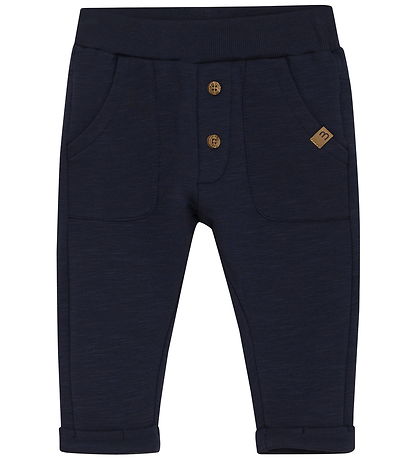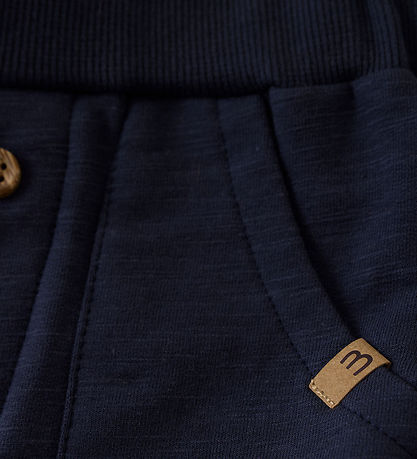 Practical Minymo sweatpants in a dark navy colour. The sweatpants are designed with a wide elastic waistband that ensures an optimal fit. The Trousers have decorative buttons at the front and two spacious pockets. The turn-up at the ankles gives a classic look.