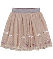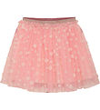 Elegant Minymo tulle skirt in pink with a fine cherry print with glitter. At the waist it has a wide elastic edge with glitter. The Minymo skirt consists of two layers with two layers of tulle on the outside and a layer of thick cotton jersey on the inside.