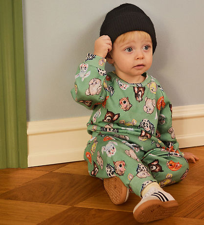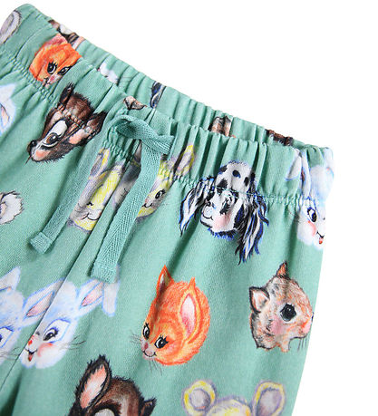 Colorful Molo sweatpants with a pattern of different animal faces in soft shades. The sweatpants have an adjustable elastic edge waistband and ribbed edges at the ankles, ensuring a comfortable fit. The inside of the trousers has soft brushed cotton. The vibrant design makes Molo sweatpants a fine choice for the wardrobe.