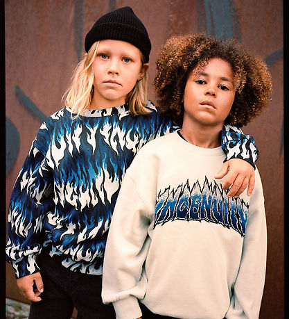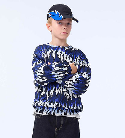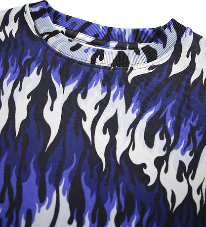 Cool Molo sweatshirt with flame print in blue, black and white. The Sweatshirt has a round neckline and long sleeves with ribbed edges at all openings. Inside is soft, brushed cotton.